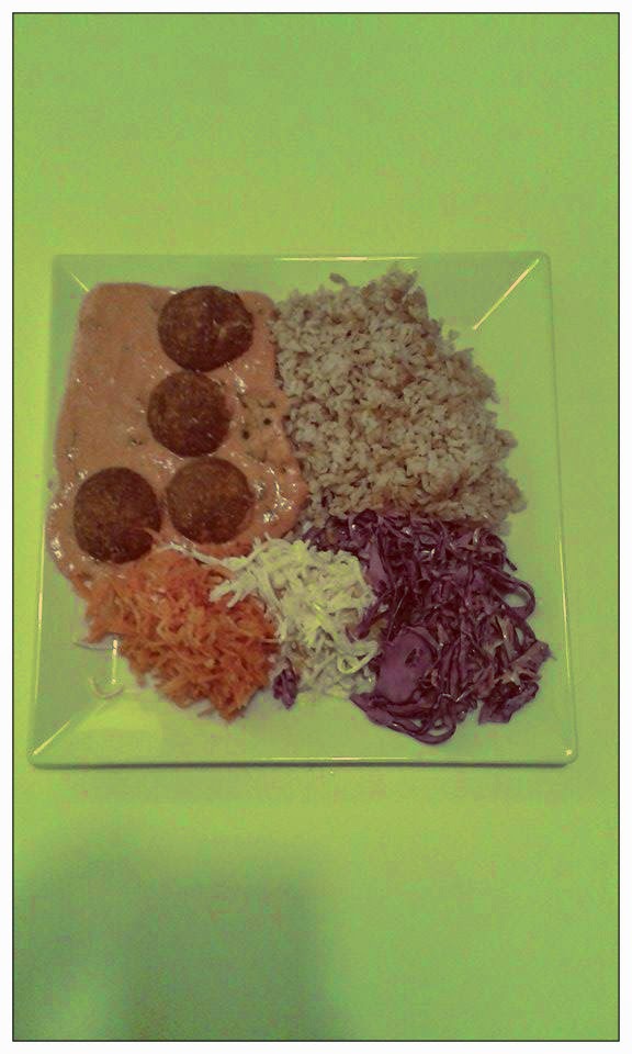 Wszamałyśmy koftę serową (4 kotleciki w przepysznym sosie),+ ryż brązowy + 3surówki z wyboru; kapusta czerwona, seler z brzoskwinią (!) oraz marchewka z ananasem (!!!) wszystko to kosztowało nas 14,30 za porcję (regularna cena 17,99-skorzystałyśmy ze zniżki studenckiej -20% yeeeah) (dobra rada; ilekroć będziecie narzekać na to, że studiujecie przypomnijcie sobie o zniżkach studenckich;D)